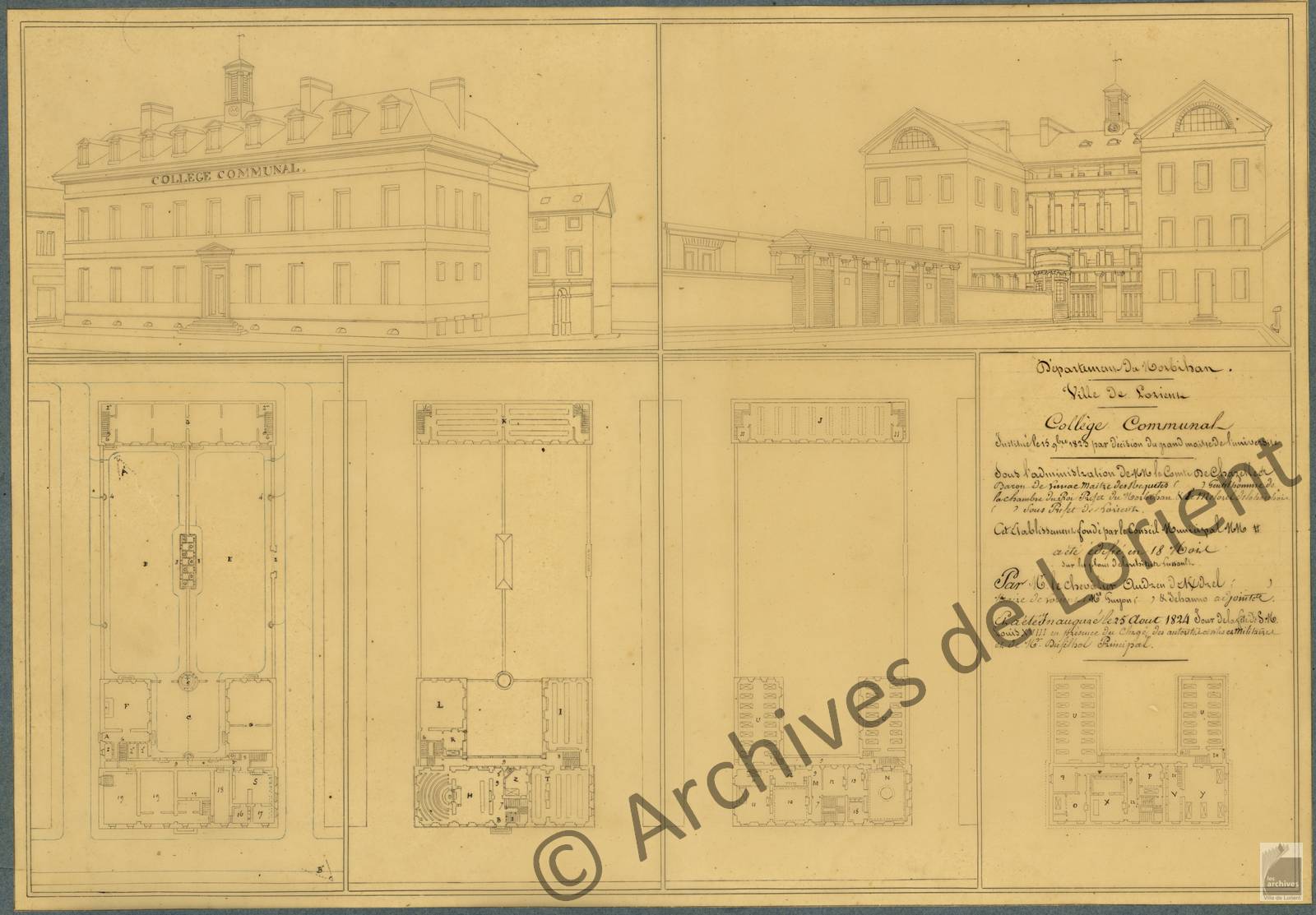 Dans un rapport daté du 16 août 1823 et accompagné d’un plan, l’architecte explique que le projet utilise deux bâtiments déjà existant et des constructions neuves qui s’adaptent au style des deux maisons déjà construites. « Cet établissement est dans une position salubre, premièrement parce qu’il est isolé des habitions voisines par quatre rues, dont trois ont trente pieds de largeur, et qu’un simple mur de clôture cerne le vaste chantier du port militaire, deuxièmement qu’en outre les rues étant toutes pavées et leurs irrigations fortement prononcées, vu la mer, jamais d’eau ne séjournera ni dans le collège ni dans les environs. » « Tous les locaux intérieurs donnent sur la cour ou les préaux et les jours du rez-de-chaussée du bâtiment principal sont élevés à une hauteur convenable au-dessus du sol. » « Les salles et chambres du pensionnat sont séparées entièrement de celles destinées aux externes. » « Pour la facilité du service extérieur et des personnes logées dans le bâtiment principal, cette partie de l’établissement, du lever au coucher, peut être totalement interdite aux pensionnaires, par ce moyen, des rapports dangereux ne pourraient avoir lieu entre les pensionnaires et les ouvriers et ouvrières employés à la journée. Parle placement de la cuisine presqu’au niveau des caves, le service des domestiques sera facile, et ne saurait interrompre l’ordre des études. « Dans ce premier projet, « comme une place est réservée dans l’église paroissiale pour messieurs les professeurs et leurs élèves, on a été dispensé de construire une chapelle dans le collège, qui d’ailleurs ne pouvait y être placé que difficilement. » L’architecte précise également que si les locaux devenaient insuffisants, l’établissement est susceptible d’être agrandi au dépend de la rue de la Concorde qui peut être supprimée sans inconvénients et en faisant l’acquisition d’une suite de vielle maison qui ouvrent sur cette rue. Selon lui, dans cette hypothèse, le collège de Lorient pourrait devenir le plus complet parmi tous ceux de son ordre. Il estime que pour la fin de l’année « où dans les premiers mois de 1824, le collège établi provisoirement dans l’Hôtel de ville sera définitivement installé dans le nouvel établissement dont les travaux sont poussés avec la plus grande activité. »