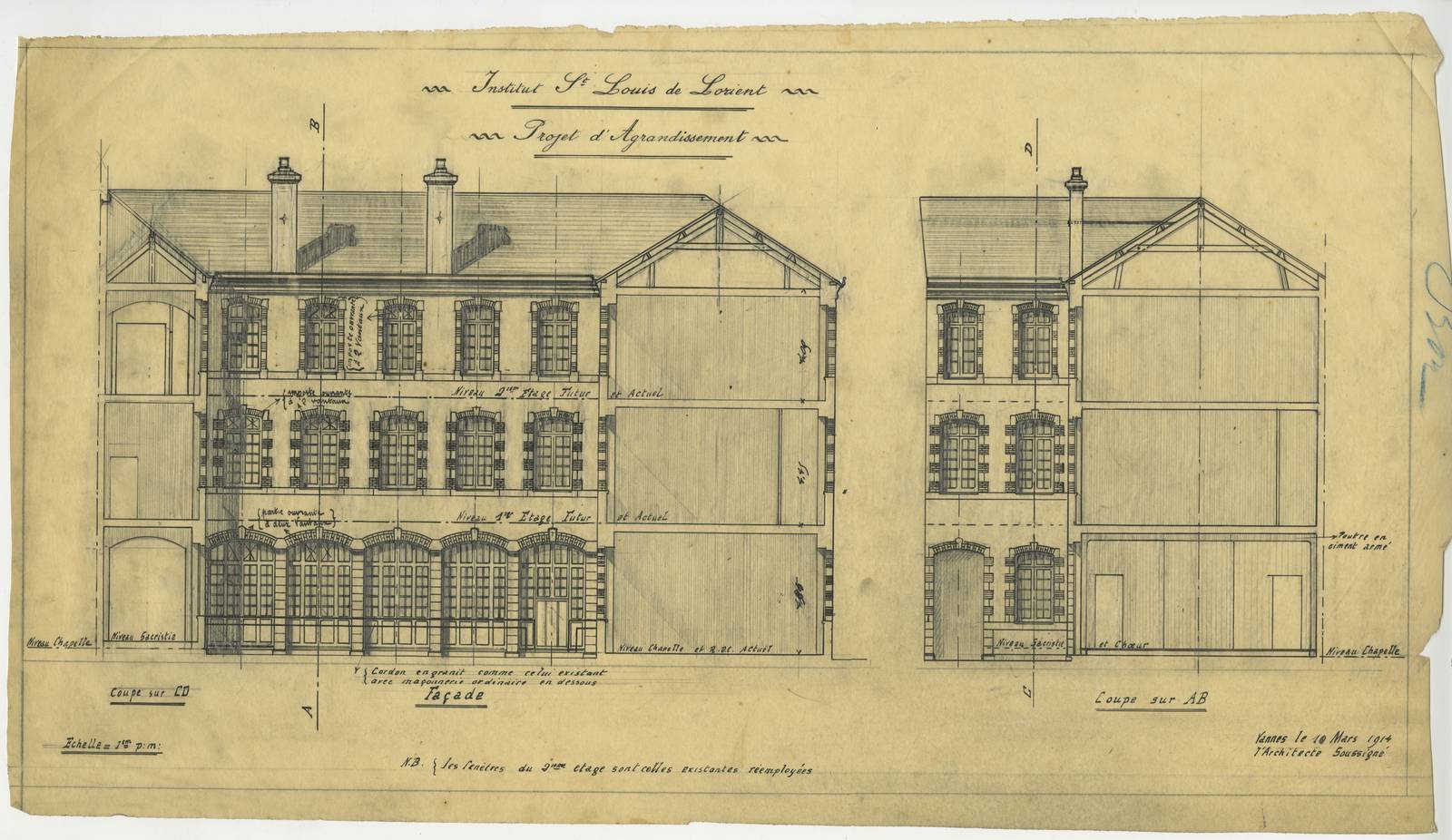 Projet d’agrandissement de l’institut Saint-Louis de Lorient : coupes, élévation, 10 mars 1914. © Archives de Lorient - 12 Fi 28