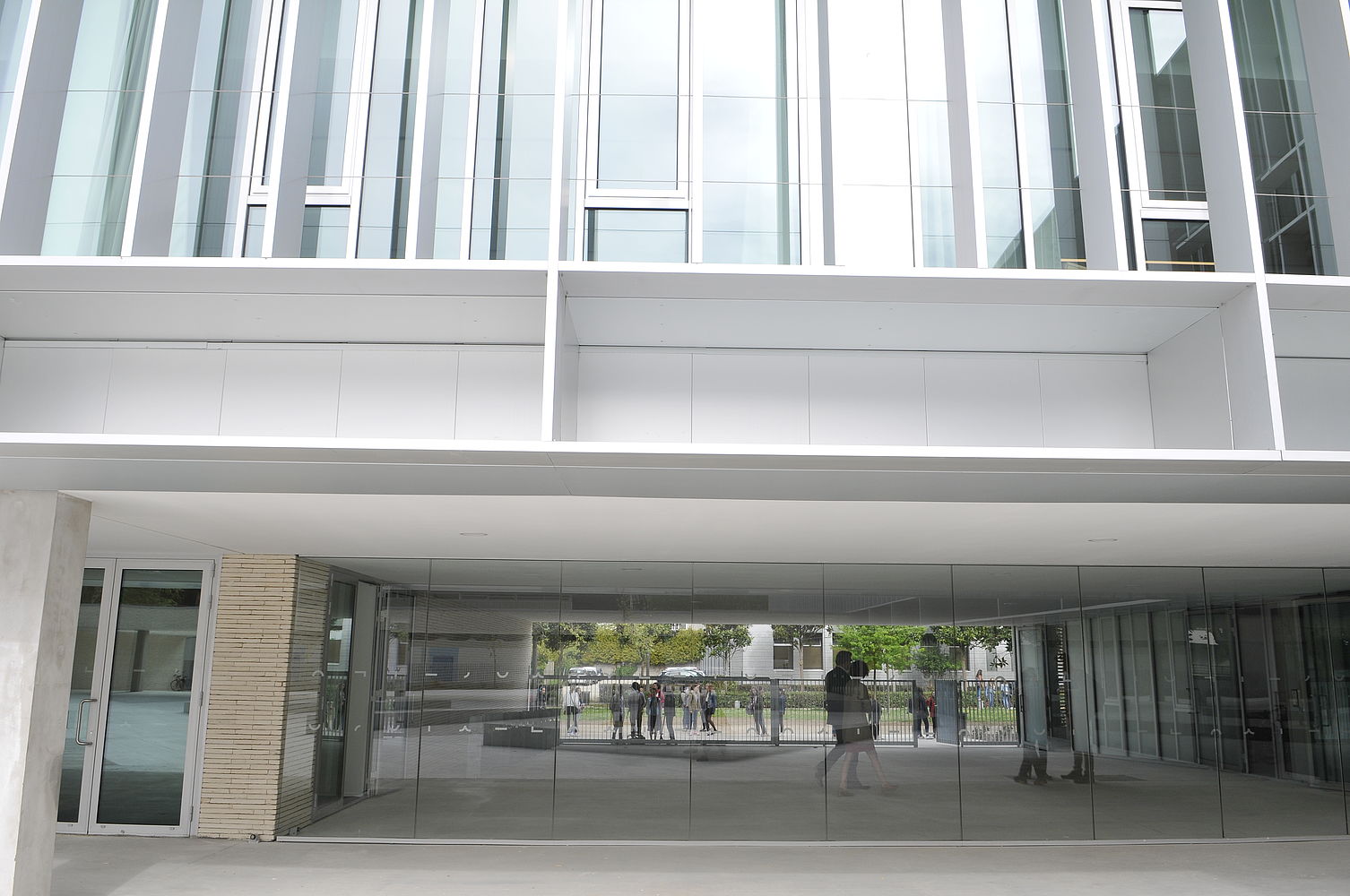 Le bâtiment est aligné sur la rue. Les fenêtres des salles de cours ouvrent vers le port de plaisance. Le collège est séparé de la rue par un mur en brique blanche qui alterne les pleins et les vides, laissant ainsi passer le regard. Par ce système, l’école est reliée à la ville tout un étant un espace protégé. Le porche d’entrée est signalée par un aplat de couleur rouge.