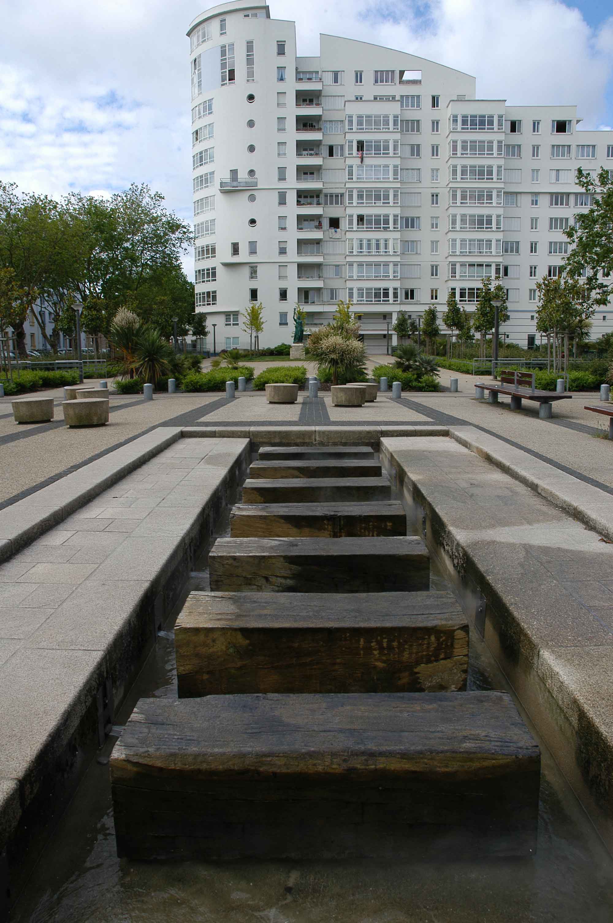 Au centre du mail Micheline Ostermeyer, dit aussi mail République, une longue fontaine dont la forme et les proportions rappellent un bassin de radoub. Ses pièces de chênes viennent de l’arsenal. Elles symbolisent les lignes de tins sur lesquelles les navires sont posés.